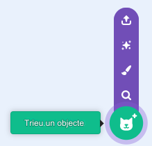 Espai on afegirem tots els elements que formaran part del nostre projecte. Des del botó circular de la part inferior dreta, accedirem a la biblioteca d'elements predefinits de Scratch, així com a les diferents opcions per crear o pujar objectes propis des del nostre ordinador.