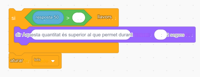 Control: En aquesta categoria trobem els blocs que permeten gestionar el flux del programa, com bucles, condicions i temps d'espera. Amb ells pots repetir accions, aturar programacions, o establir controls lògics que determinin el comportament dels objectes en funció de diferents condicions.