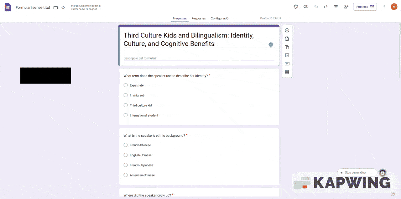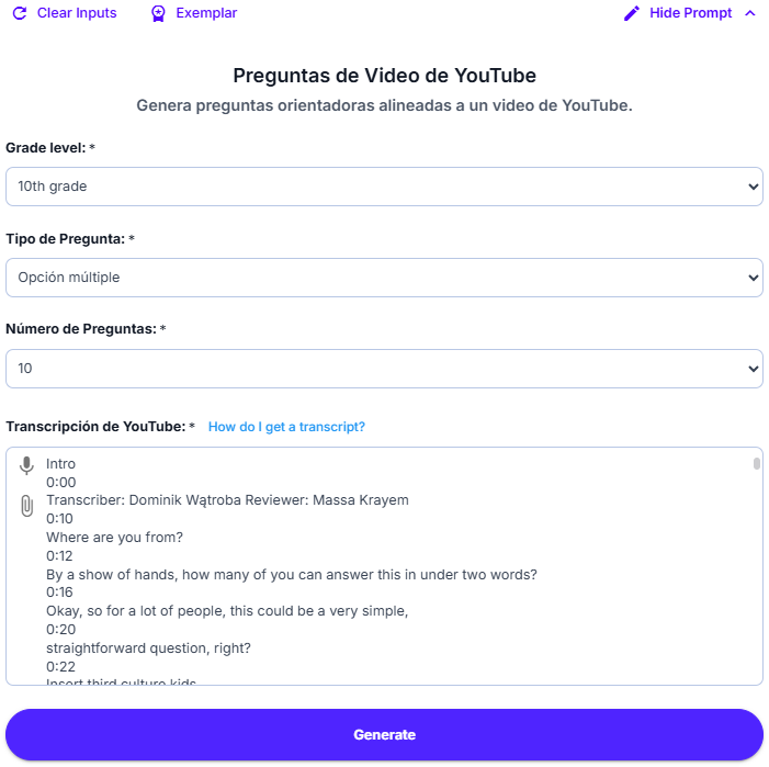 Hem d’emplenar els camps (nivell, tipus i nombre de preguntes i enganxar la transcripció del vídeo) i clicar a “Generar”: