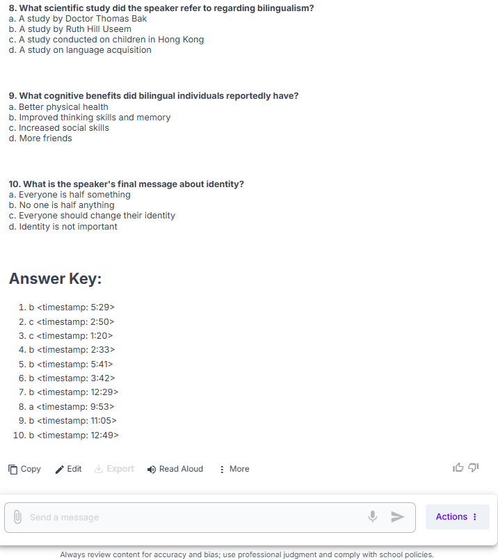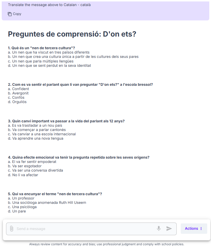 Ens marca al vídeo d’on ha tret les preguntes, i de la mateixa manera que amb els qüestionaris sobre un text, genera les 10 preguntes i les respostes amb la correcta en negreta i podem seleccionar les que ens agradin i editar les respostes. També obtenim els objectius, les preguntes de discussió i el llistat de vocabulari que podem copiar.