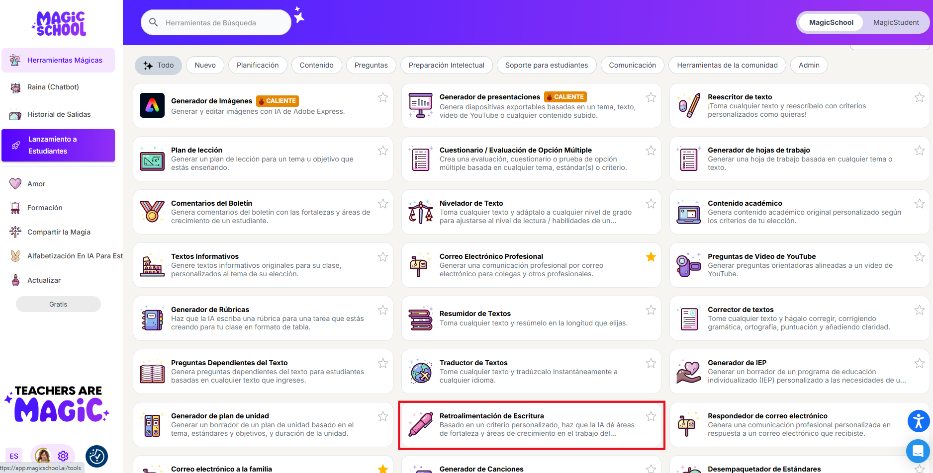 Magic School disposa de l’eina “Retroalimentación de Escritura”, que ens pot ser útil a l’hora de corregir textos llargs i oferir suggeriments de millora perquè: