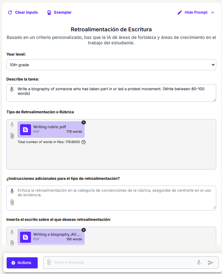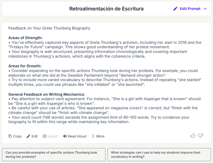 - Ofereix retroalimentació ajustada al nivell educatiu i lingüístic de l’alumnat, assegurant que els suggeriments siguin comprensibles i útils.