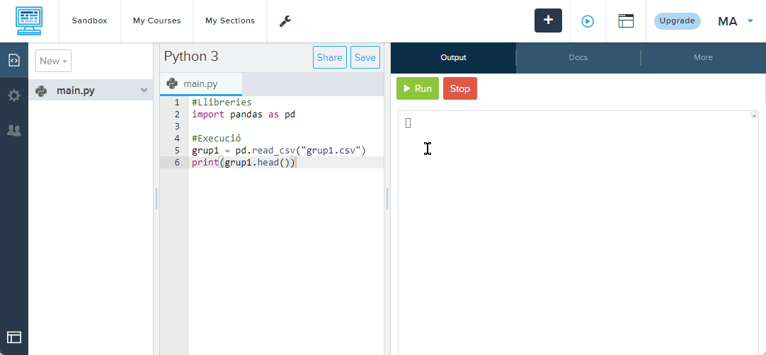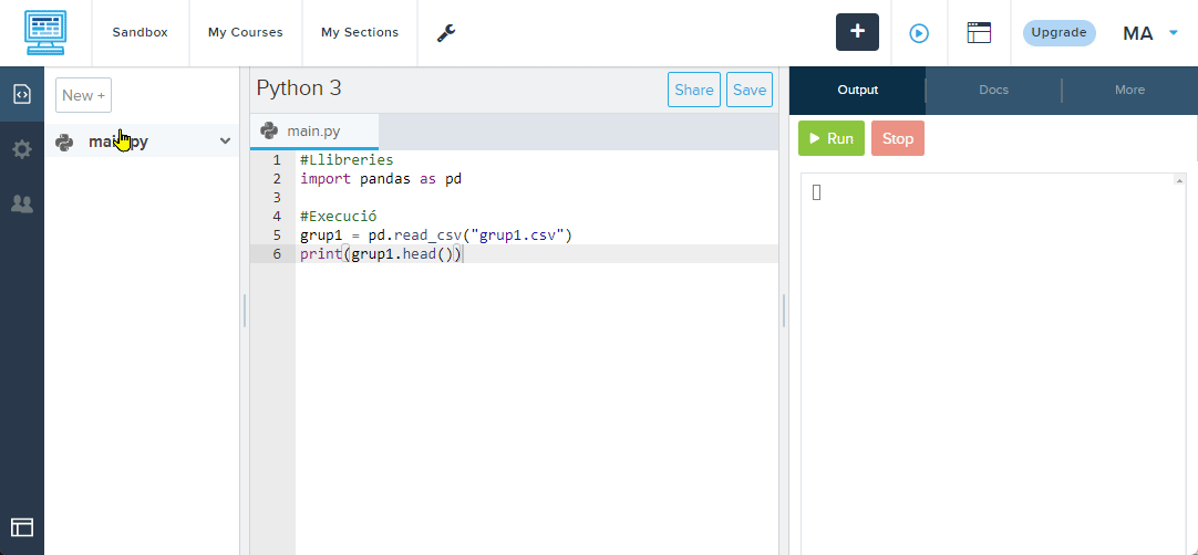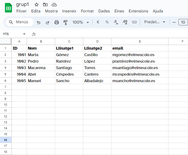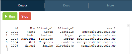 Exemple 2: Avançam un poc més en aquest segon exemple on tractarem que el paquet llegeixi les dades incloses en un arxiu CSV amb nom "grup1" (arxiu de text pla amb els valors separats per comes "," o punt i coma ";") amb informació d'alumnat per finalment generar un DataFrame (graella) amb aquesta informació.
