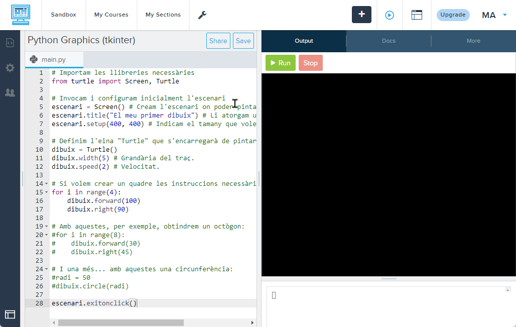 Com podeu veure, a CodeHS existeixen diverses consoles creades específicament per executar un tipus de llibreria concreta. En el cas de codi on s'empra el mòdul Turtle, s'haurà d'executar amb la consola Python (turtle) o Python 3 Graphics (Tkinter), com és el cas de l'exemple anterior.