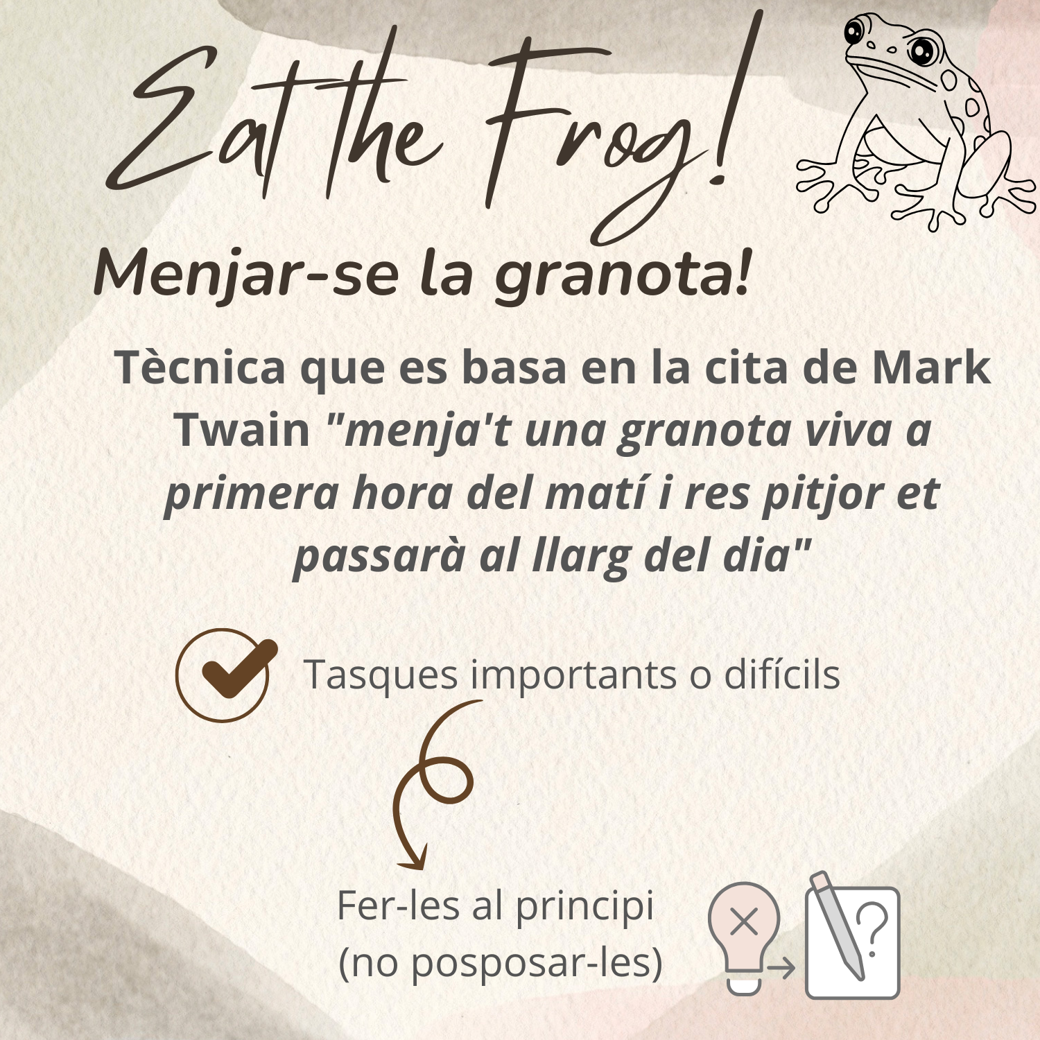 CEP IBSTEAM. Mètode de Pomodoro (CC BY-NC-SA) - Menjar-se la granota (“Eat the Frog”): es basa en la cita de Mark Twain "menja't una granota viva a primera hora del matí i res pitjor et passarà al llarg del dia" i et convida a començar la teva jornada amb les tasques més importants o difícils.