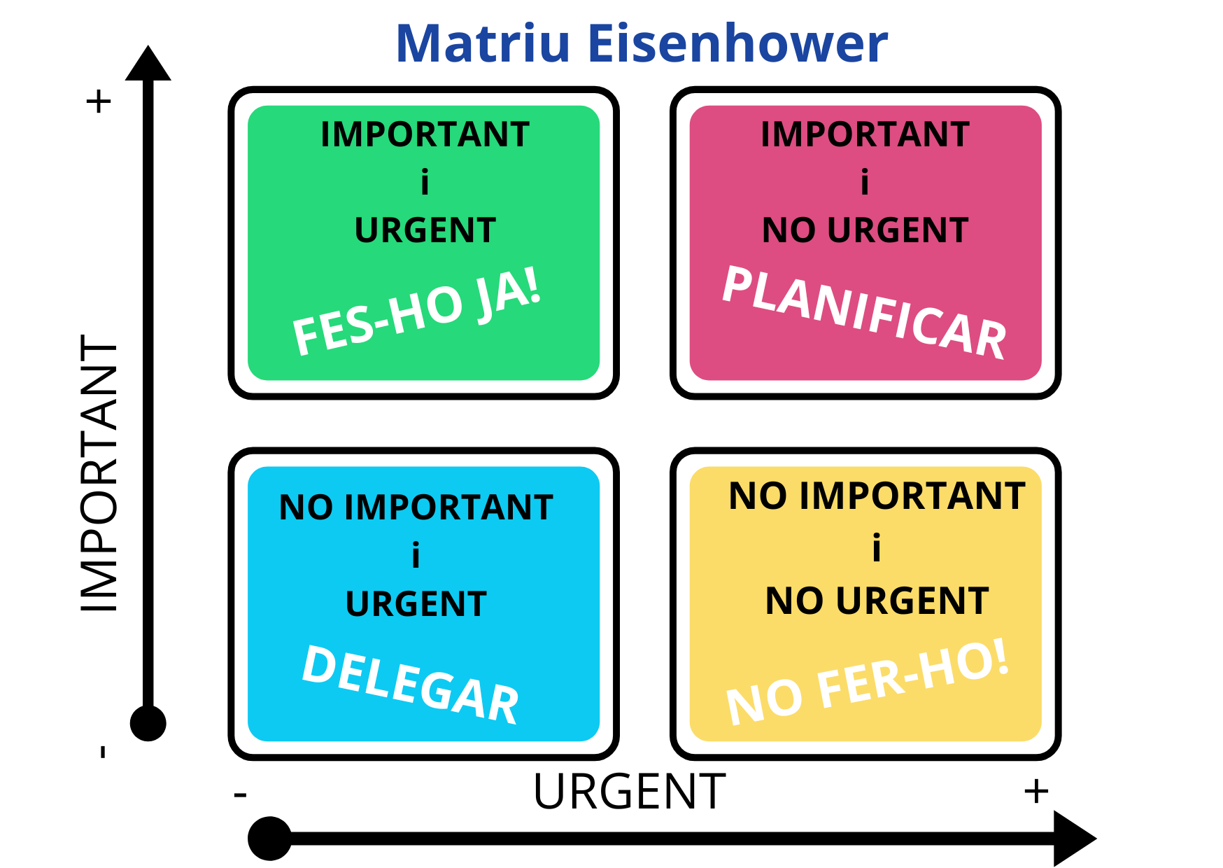 Matriu Eisenhower. Consisteix a representar gràficament les tasques en un quadre de quatre quadrants, segons la seva urgència (la rapidesa amb què cal fer-les) i importància (com afectaran els teus objectius). Els dos primers quadrants representen les activitats a les quals hauries de dedicar més esforços (les urgents i importants, i les importants però no urgents); i els dos últims, les que hauries de deixar per a més endavant o bé reduir (urgents però no importants i ni urgents ni importants).