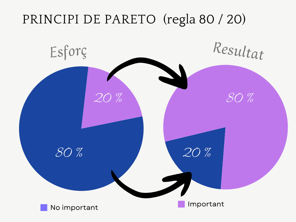 Principi de Pareto (regla 80/20): aplicat a la gestió del temps, suggereix que el 20 % de les nostres tasques són responsables del 80 % dels resultats. És una invitació a identificar quines accions contribueixen més als teus objectius i concentrar-hi els teus esforços.