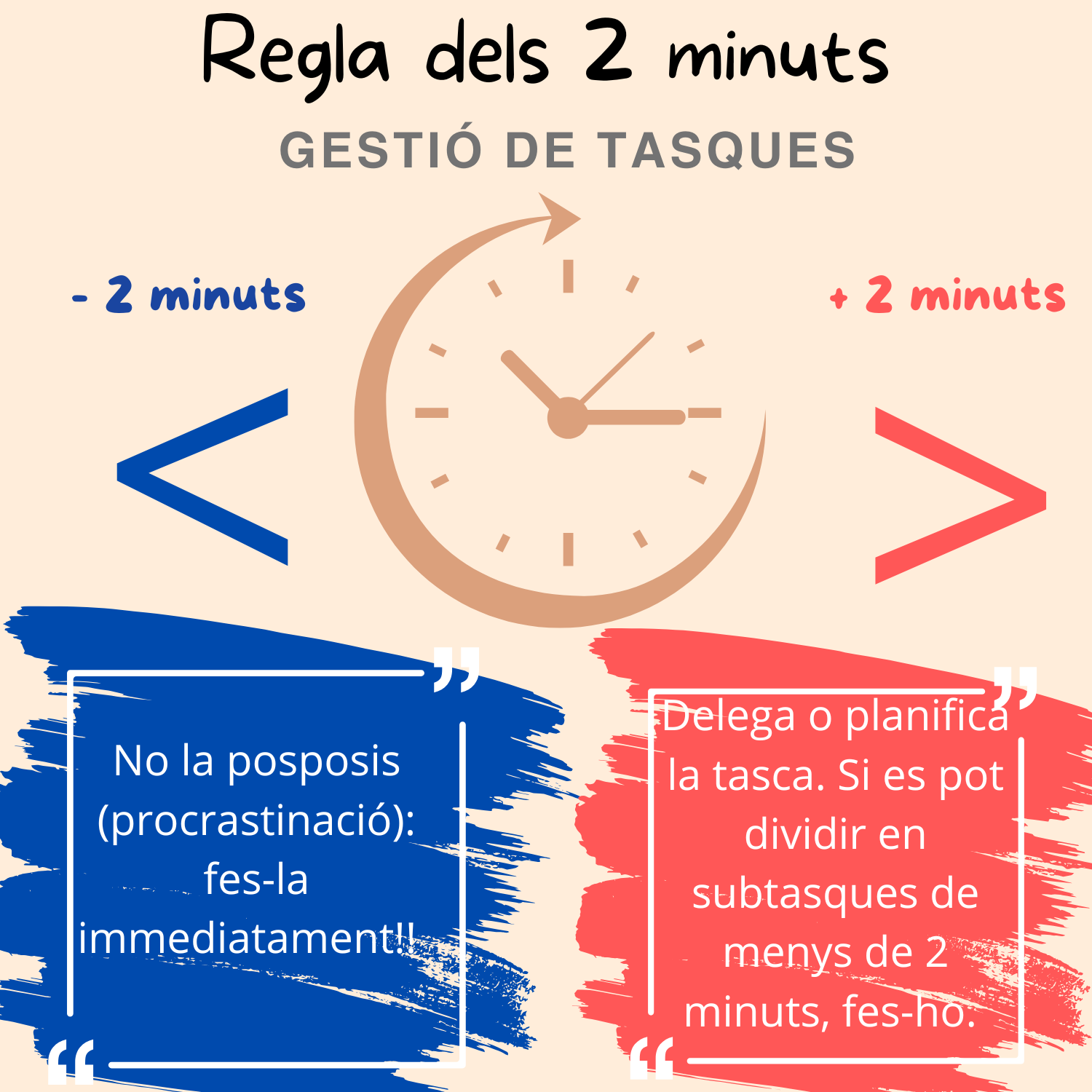 - Regla dels 2 minuts: aquesta és una regla simple i directa. Si has de fer una tasca que consideres que la podràs completar en menys de dos minuts, en lloc d'ajornar-la, fes-la immediatament. No permetis que s'acumuli a la llista de tasques pendents. Aquesta regla es basa en la premissa segons la qual dedicar només dos minuts a una tasca et pot estalviar temps i preocupacions a llarg termini.