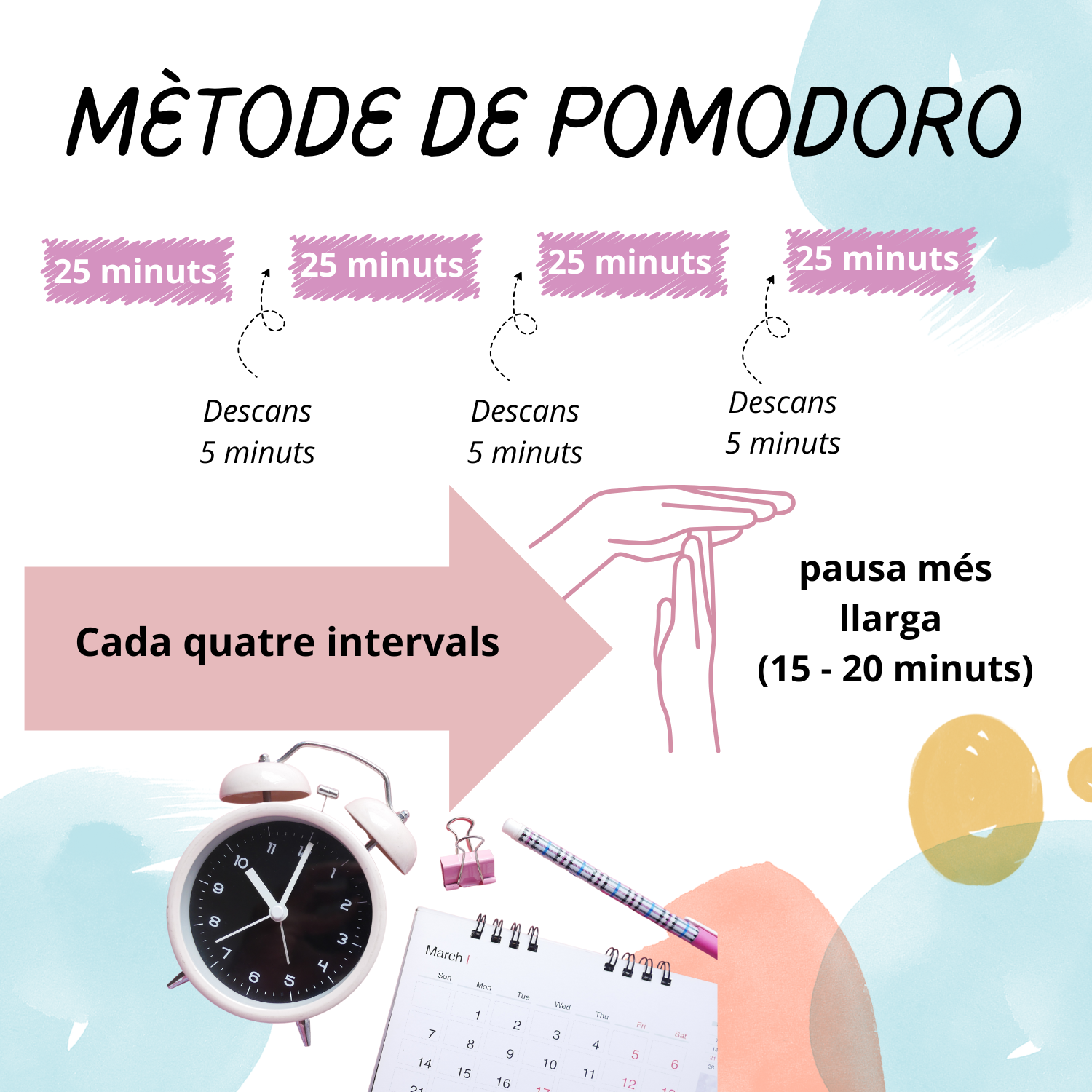 CEP IBSTEAM. Regla dels 2 minuts. - Tècnica Pomodoro: consisteix a dividir la jornada en intervals de 25 minuts seguits de 5 minuts de descans (pomodoros). Cada quatre intervals es recomana fer una pausa més llarga per mantenir la concentració i evitar la fatiga mental.