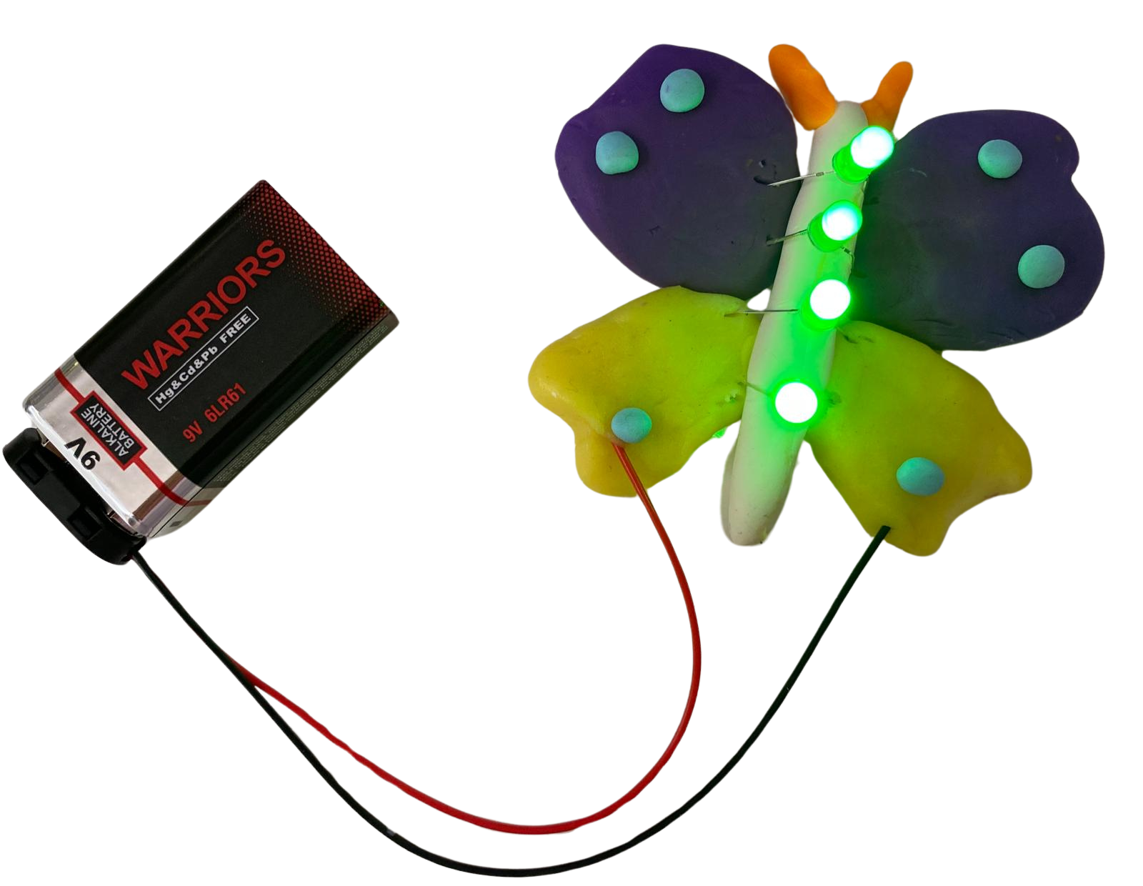 Amb les nocions bàsiques apreses a les experiències anteriors, pots deixar córrer la teva imaginació i creativitat, i crear circuits vistosos amb plastilina de colors. Alerta! Has d’evitar els circuits oberts i els curtcircuits i connectar els LEDS en el sentit adequat.