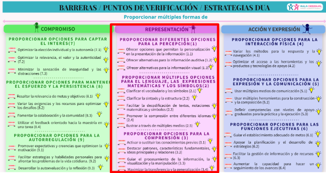 In this module, we will explore digital tools and resources that facilitate the representation of information and help reduce barriers. Referring to the image on the left, we will focus on the Principle of Representation, located in the center. However, we will primarily concentrate on guideline 1, related to perception, while also covering some aspects of guideline 2, related to language, and guideline 3, related to comprehension.